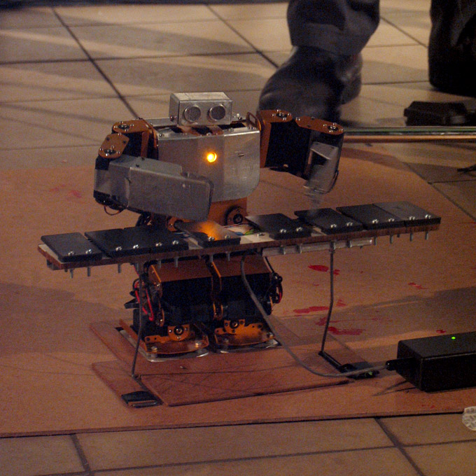 I made a basic synthesizer keyboard sized to Mofo's dimensions, with 8 keys. Based on analog oscillators, the instrument delivers a raw square wave when hit by mofo's aluminium rigid hands.