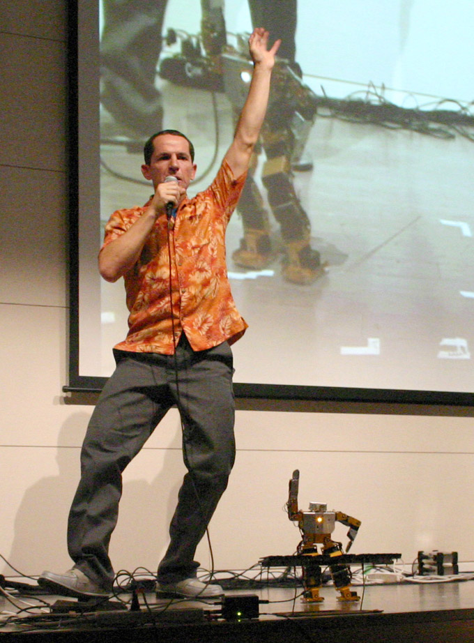 The show, which lasts approximately 50 minutes, features a talk reflecting on some aspects of contemporary robotics. I play video extracts of Boston Dynamics Big Dog in action as well as the famous video of Asimo grounded after falling down a flight of stairs. I show the latter in a slightly smug manner as my robot Mofo can get itself back to a standing position if it falls (which it does quite often).