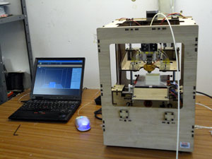 Software installation on a windows xp laptop was smooth: a control software called ReplicatorG, using Skeinforge G-Code generator and Python. G-Code is the language spoken by most computer numerical control (CNC)