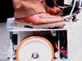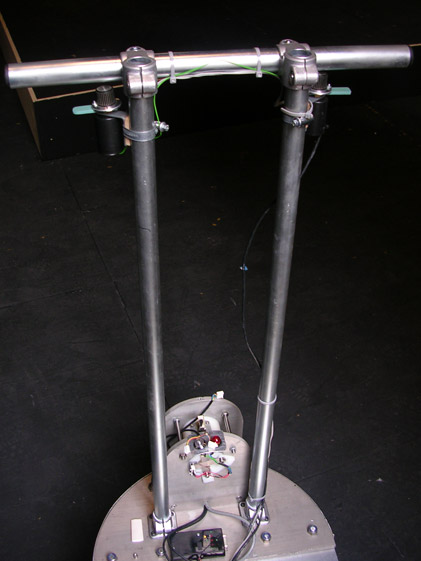 Receiving information from the sensors via a headmounted display (one led per sensor, no other visual information), the user can pilot the Female sexed robot with two handles that control the wheels.